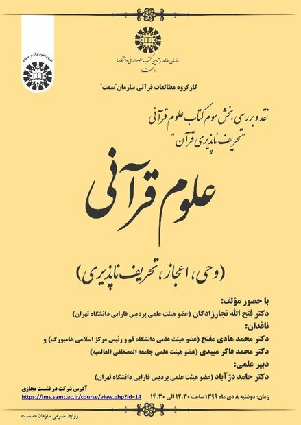 نشست نقد و بررسی بخش سوم کتاب علوم قرآنی با عنوان تحریف ناپذیری قرآن، دوشنبه ۸ دی ماه برگزار می‌شود.